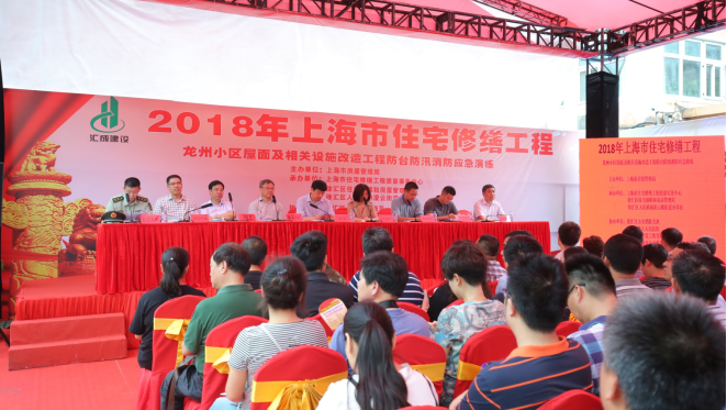 7月6日上午9时30分,由上海市房屋管理局主办,上海市住宅修缮工程质量事务中心、徐汇区住房保障和房屋管理局、徐汇区人民政府凌云路街道办事处,承办的2018年上海市住宅修缮工程防汛防台消防应急演练在上海市徐汇区龙州路450弄龙州小区举行。市住建委金晨秘书长、市房屋管理局冷玉英副局长出席并讲话,徐汇区住房保障和房屋管理局茹国明局长担任演练总指挥。委应急办局更新处、市修缮中心、消防支队、汇成集团及市14区有关部门、兄弟单位等现场观摩了演练,并进行了指导。