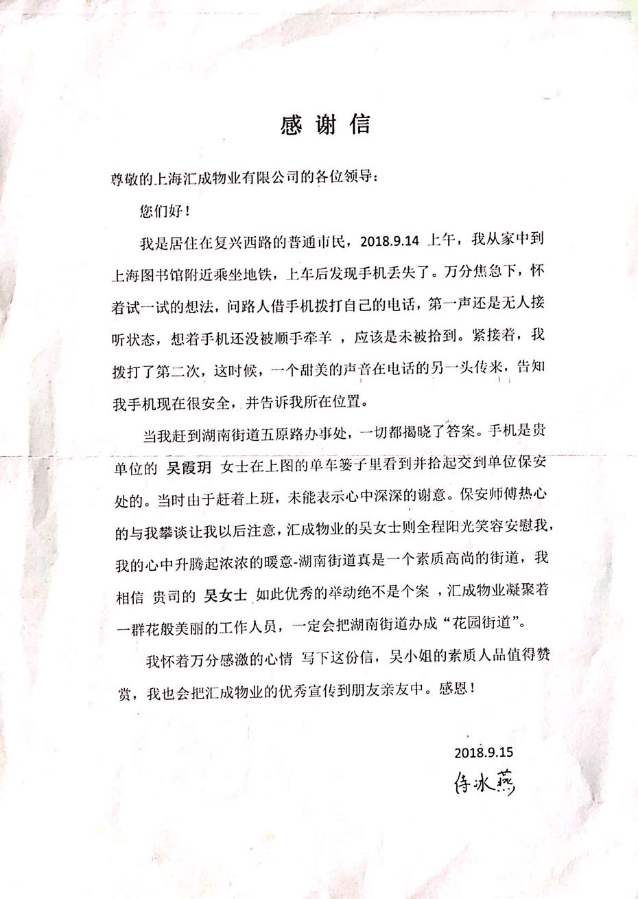 我在马路边捡到一分钱,把它交给警察叔叔手里边…”这是我们耳熟能详的一首儿歌,旨在发扬拾金不昧这一传统美德,其实在我们的生活中就有这么一群默默无闻的践行者。“嘟嘟嘟…”“您好,您的手机被我捡到了,我是湖南街道汇成物业的员工吴霞玥,地址是…”此时的侍小姐激动地连声向电话那边致谢。