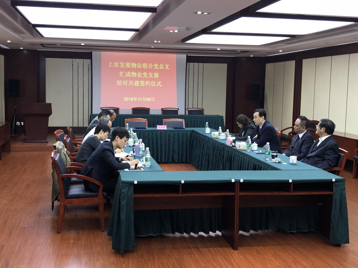 2018年11月8日,在漕河泾实业大厦上实发展物业联合党总支与汇成物业党支部进行了“党建共建协议的签约”仪式,上实发展联合党总支成员和汇成物业党支部的成员参加了签约仪式。