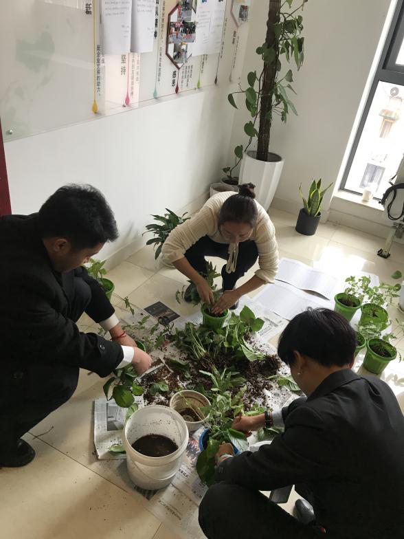 将几盆原本已经枯萎的植物在分别种入生命力较强的绿萝,大家齐心协力,撩起袖管、不怕脏、不怕累,在冬季的早晨创造出了一丝青翠欲滴生机勃勃的绿意。在这些绿色植物的点缀和衬托下,交易中心绿意盎然。植物的后期养护工作也由客服部自发认领,负责日后的管看与养护。