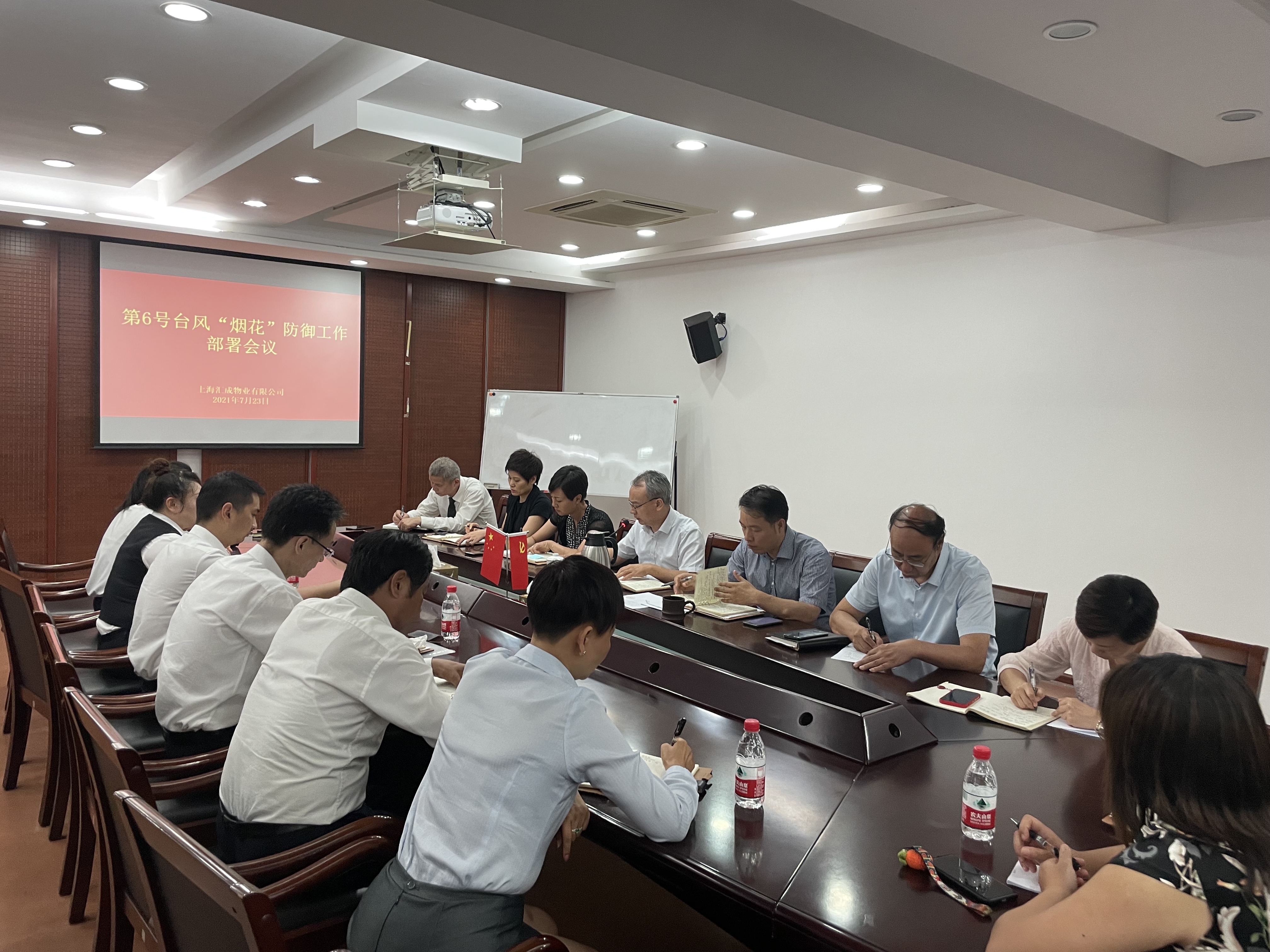 7月24日晚,上海中心气象台发布台风橙色预警后,领导班子及有关部门人员立即前往公司本部值守。通过项目现场执法记录仪传送的信息进行远程监控指挥,并带队实地察看宛平剧院、汇成苑等10余个项目防汛落实情况,对于防汛设施使用、物资配备、值班值守等情况进行详细的检视和指导。