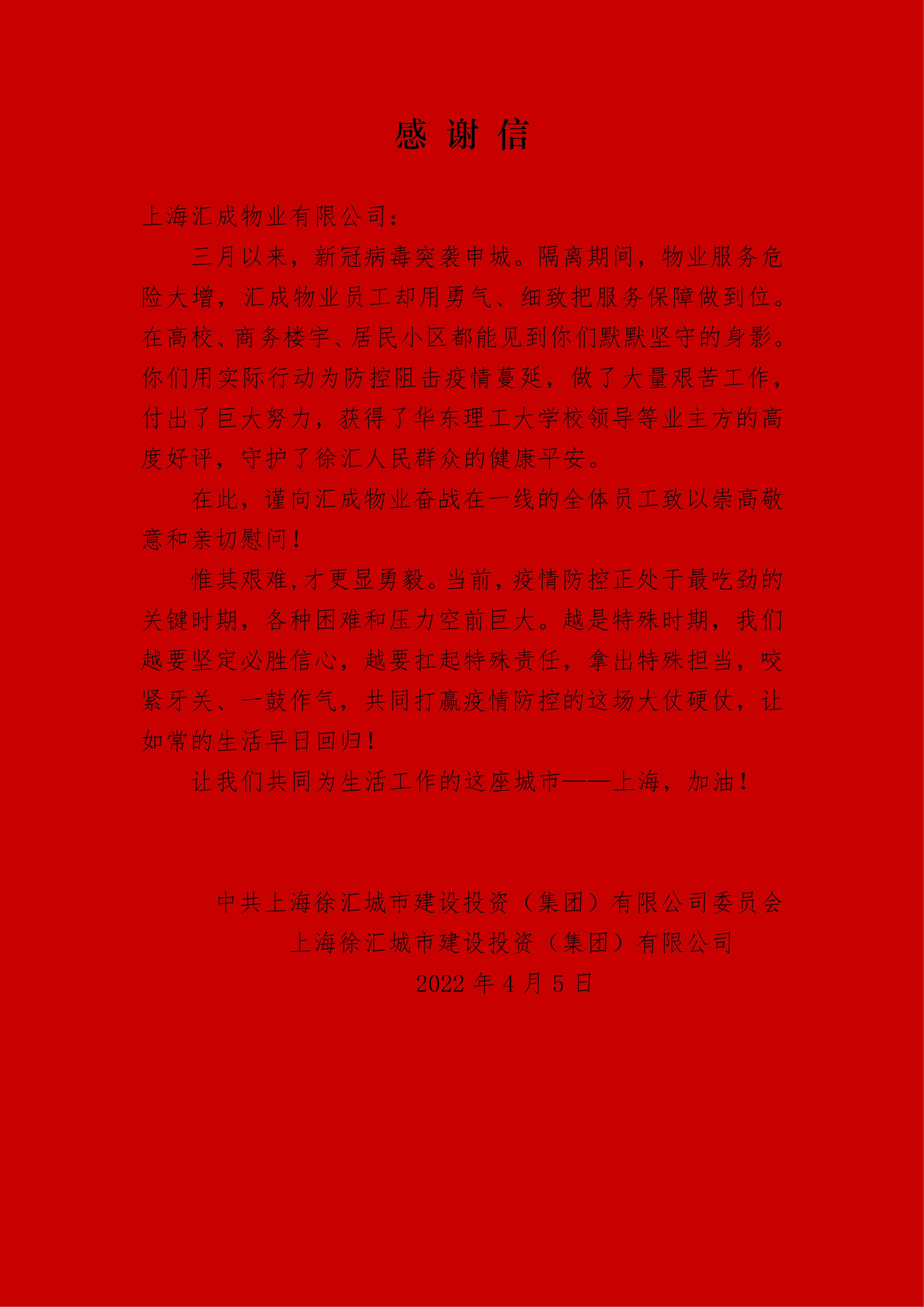 感谢信—中共上海徐汇城市建设投资(集团)有限公司委员会 上海徐汇城市建设投资(集团)有限公司