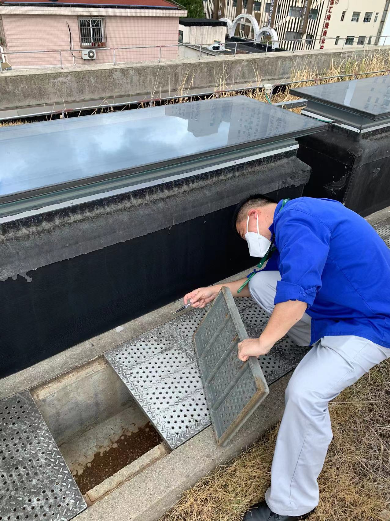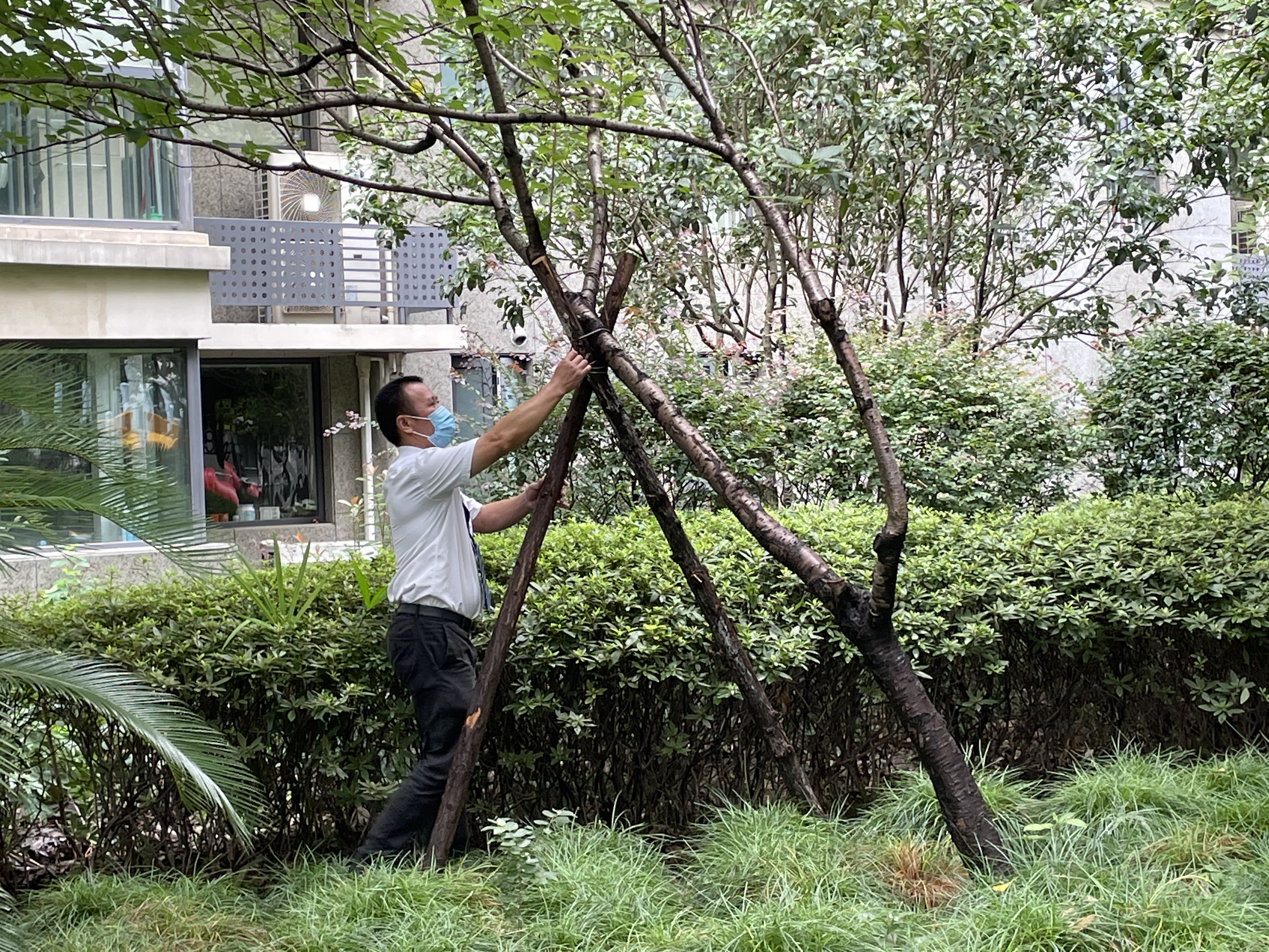 每当台风,公共区域的安全是重中之重。为了确保不发生意外,项目人员在大检查的同时,进行预防性维护和养护。对于屋顶可能产生的漏水点加盖防水油布19次,修剪和加固绿化树木18棵。为避免发生高空坠物安全事件,公卫中心的保安人员将国旗提前降旗,并提醒业主出门关窗,避免阳台上放置的花盆等物被风刮落。