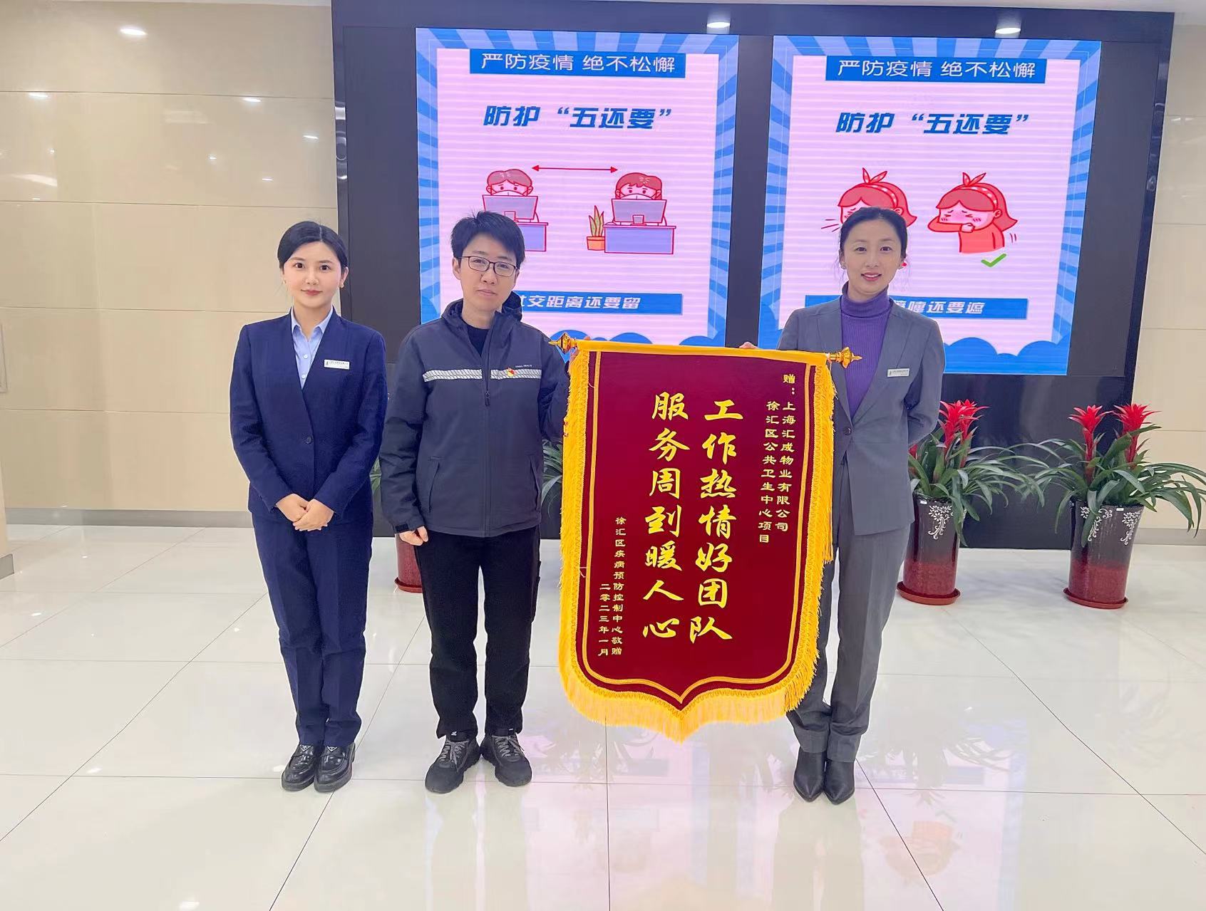 徐汇区公共卫生中心项目在疫情防控战中,展现出强大的团队凝聚力,为机构单位提供暖心细致的服务,展示了汇成物业良好的企业口碑和形象。今年疫情结束后,他们收到了来自徐汇区卫生健康委员会监督所的表扬信和徐汇区疾病预防控制中心赠送的锦旗。